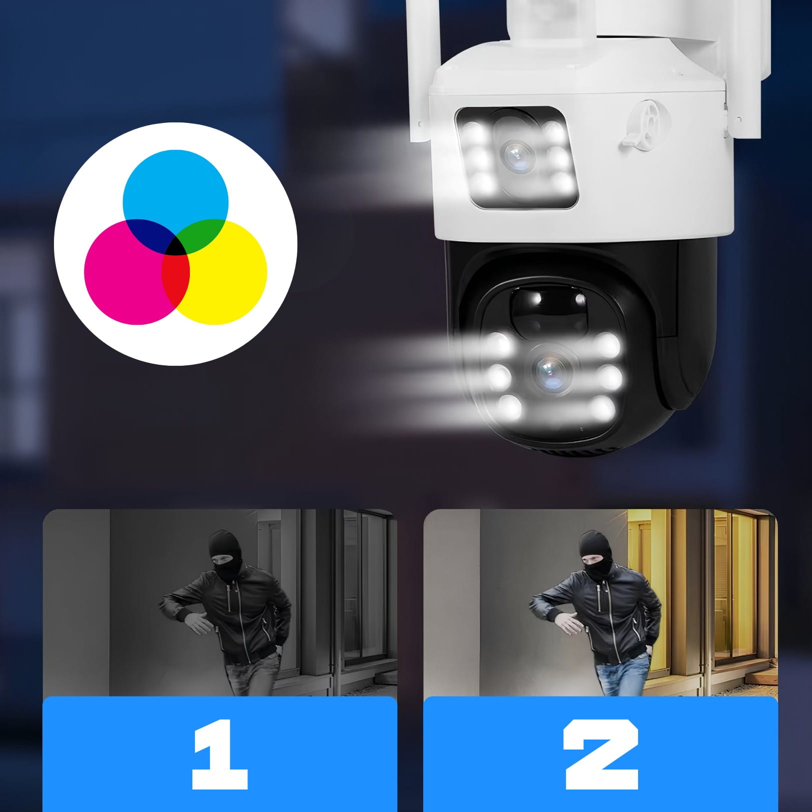 - Wizja Nocna IR: Mocne diody na podczerwień zapewniają doskonałą widoczność w całkowitej ciemności na dystansie 10-15 metrów.