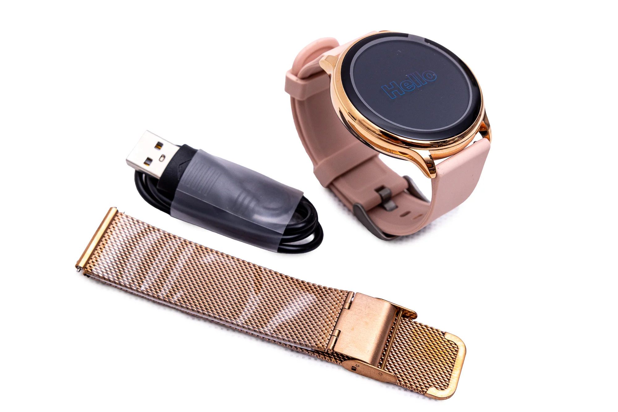 W zestawie: Smartwatch, bransoleta mesh, pasek gumowy, magnetyczny kabel USB.
